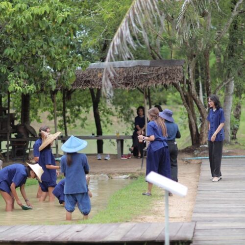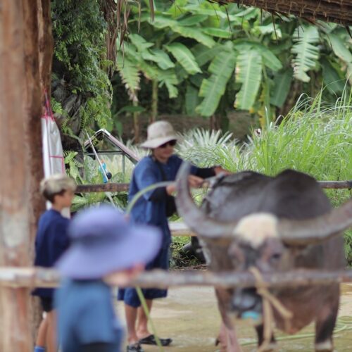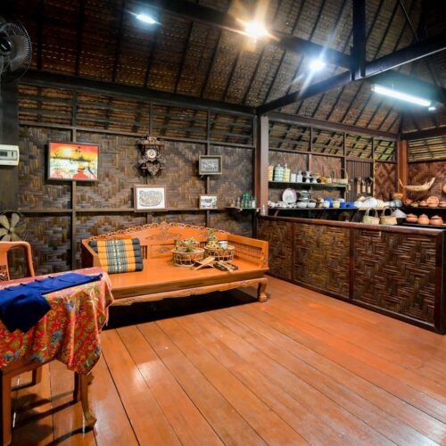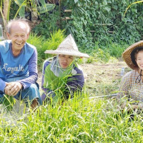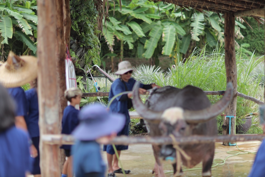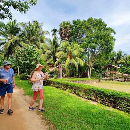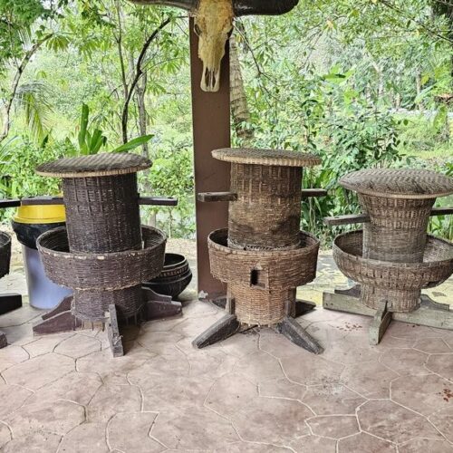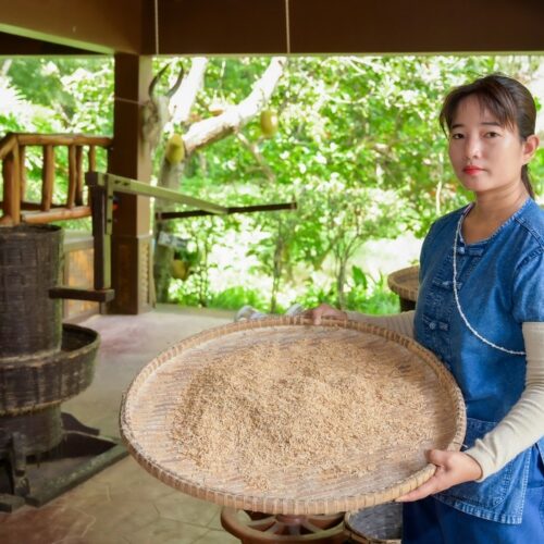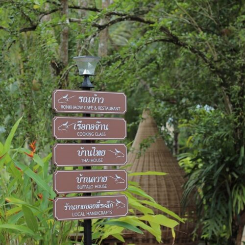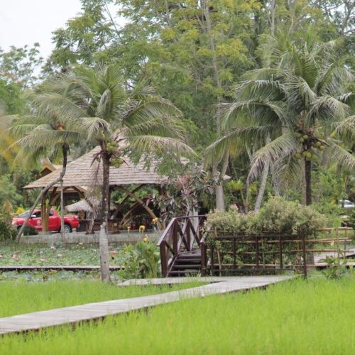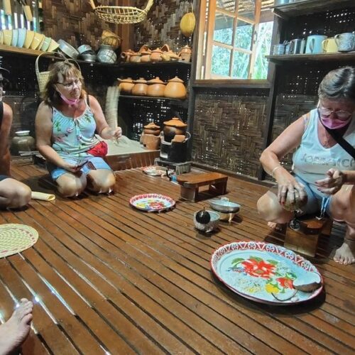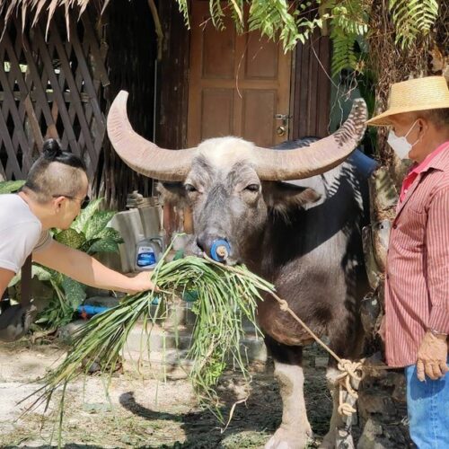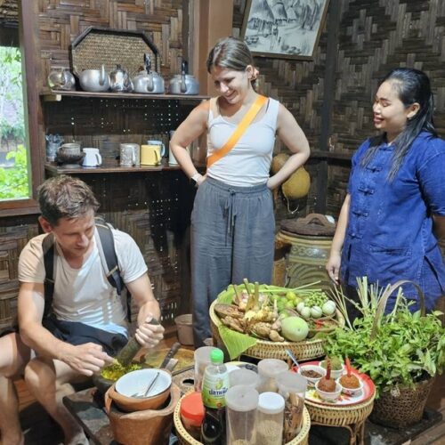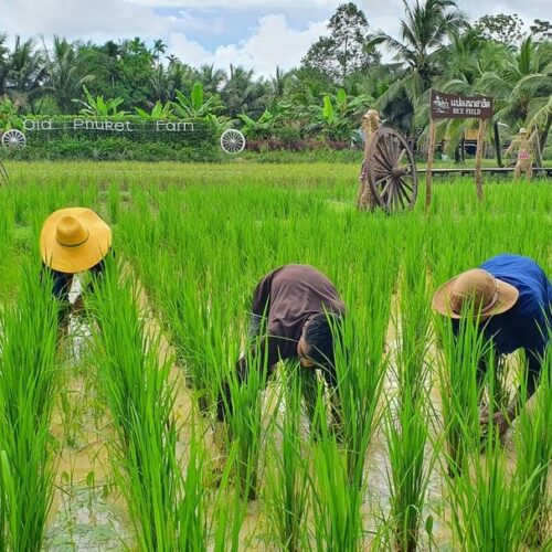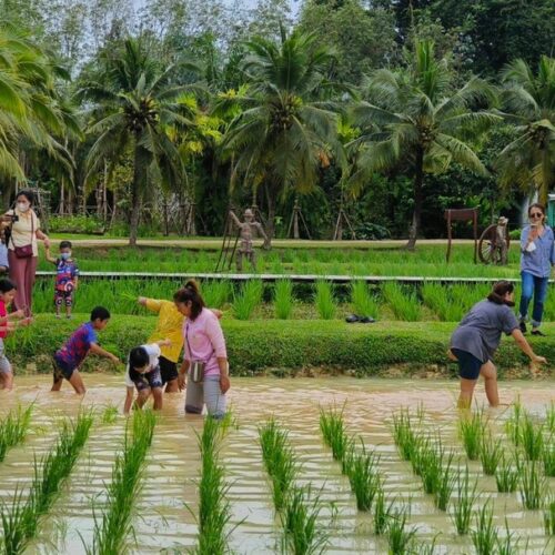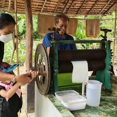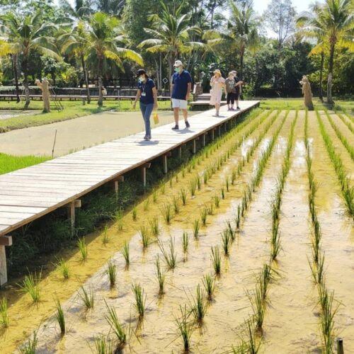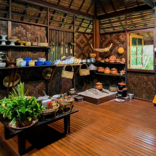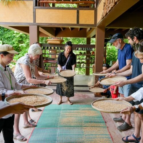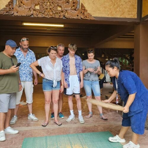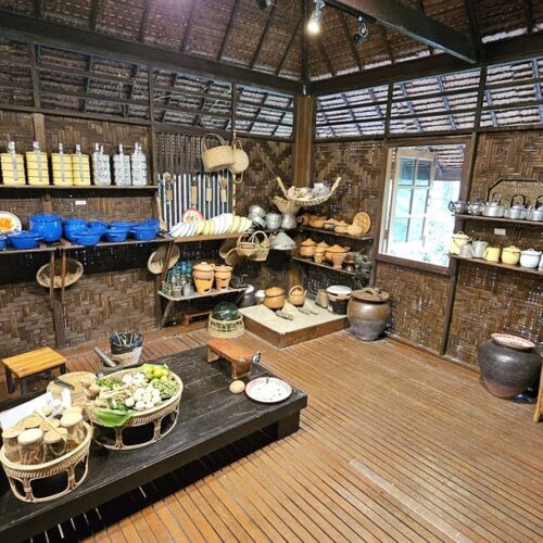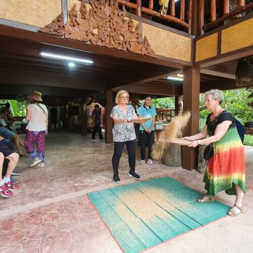🏠 Thai Traditional House / Explore a beautiful Thai house and enjoy cultural demos: rice milling, winnowing, curry paste making, and hand-pressed coconut milk.