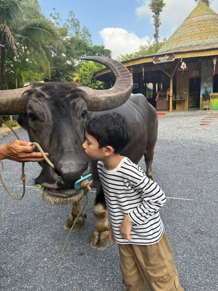 Nong Pho had the chance to bathe a gentle buffalo and try planting rice — activities that are both playful and educational, giving kids hands-on experiences of Thailand’s farming heritage.